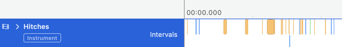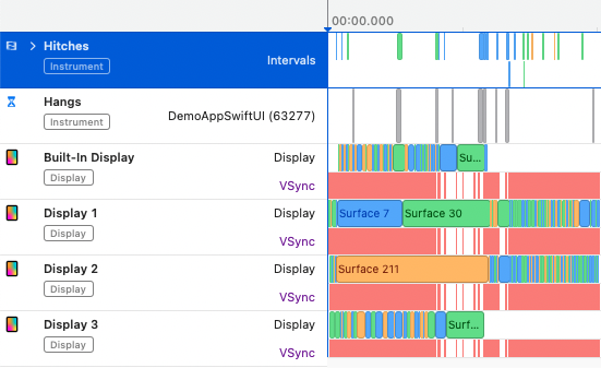 You can see a bit more orange in this example. There are more hitches that go over the acceptable latency of 33 ms. This results in some visible hangs, both in instruments, as well as visually while performing the tests.